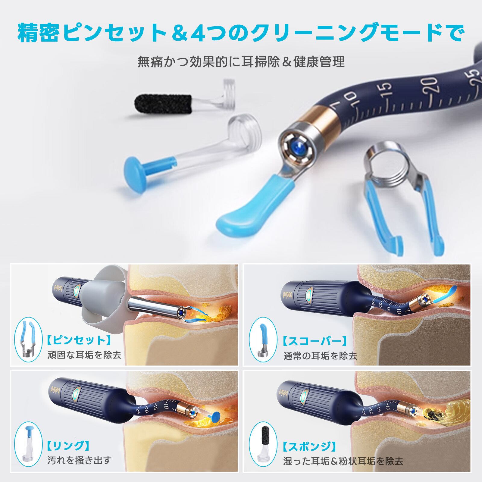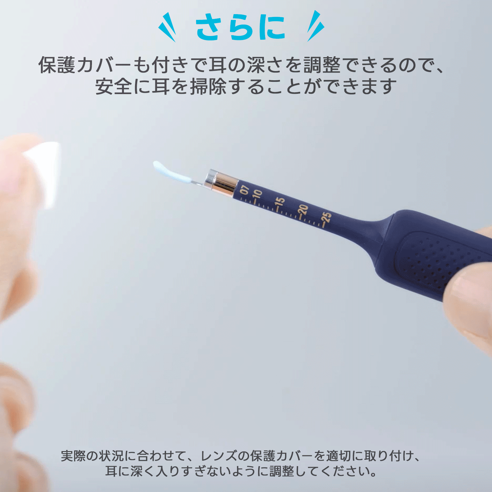 本体先端には高画質カメラとLEDライトを搭載。暗くなりがちな耳の中も明るく鮮明に映し出します。スマホ画面を見ながら操作できるため、耳を傷つけにくく、従来の耳かきが苦手な方にもおすすめです。